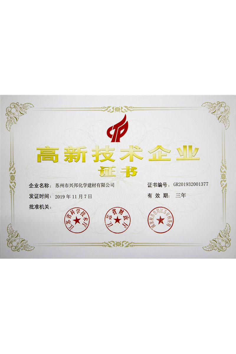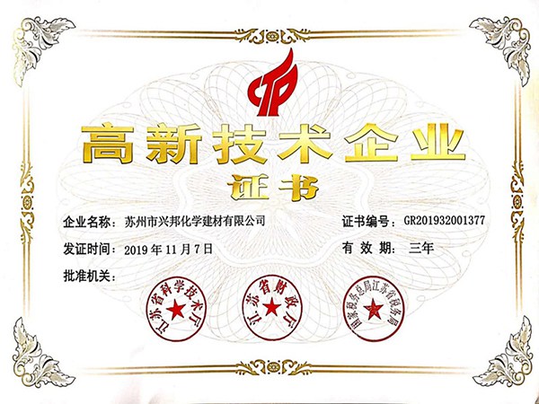 興邦擁有經驗豐富的高水平科研技術團隊,完整的科研管理體系,及完善的科研測試硬件設備。良好的軟硬件條件和持續(xù)的科研投入帶來累累碩果,興邦產品和為客戶提供的配方開發(fā)支持獲得客戶一致好評,累計獲得授權的發(fā)明專利超13件、實用新型超4件,累計參與國家、行業(yè)及團體標準超20項。與此同時,興邦自2016年被首次認定為高新技術企業(yè)以來,已經連續(xù)三次順利通過高企審核。公司技術研發(fā)中心被認定為“蘇州市綠色節(jié)能建筑材料工程技術研究中心”、“蘇州市企業(yè)技術中心”、“江蘇省無機膠凝材料外加劑工程技術研究中心”等等。